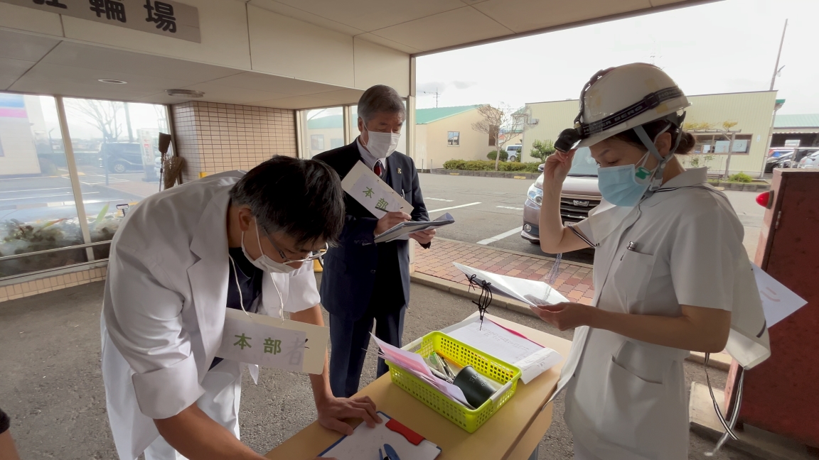 地震発生時の身の安全の確保から各部署の被害状況の把握・報告、その後の火災発生による初期消火から外来患者さんの避難・避難状況の確認と、実際の災害時のように目まぐるしく変化する状況にも対応できるよう動いてもらいました。